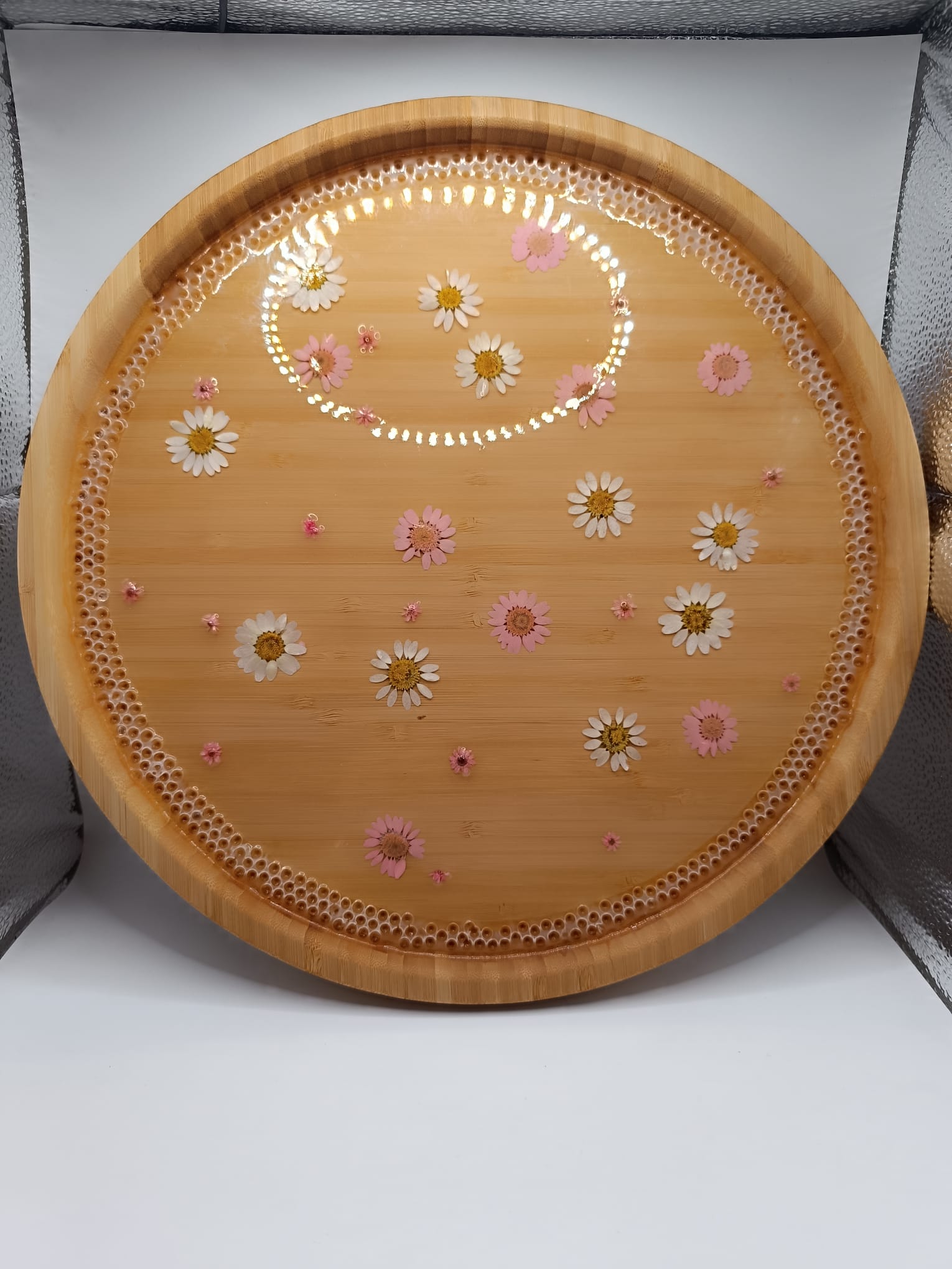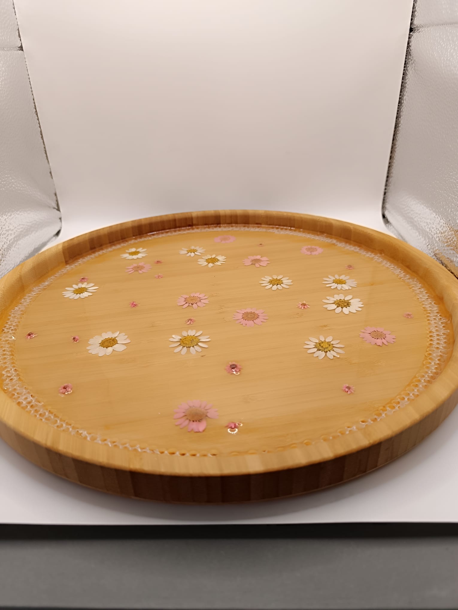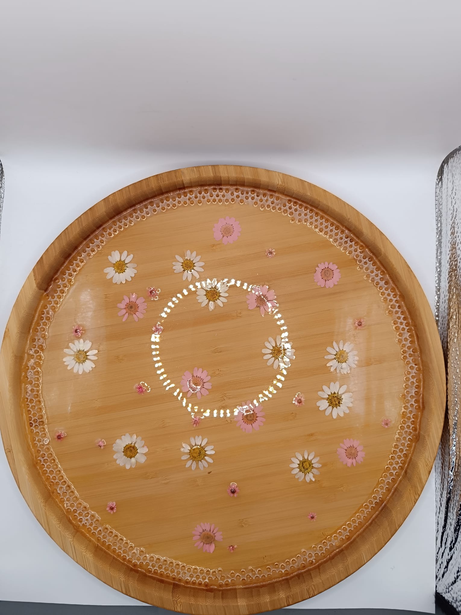 Apportez une touche de nature à votre intérieur avec ce magnifique plateau en bois sublimé par de la résine cristalline et des fleurs naturelles délicatement intégrées. Chaque pièce est unique, capturant l’élégance des pétales figés dans le temps. Parfait pour servir vos boissons, décorer une table ou offrir un cadeau raffiné et personnalisé.