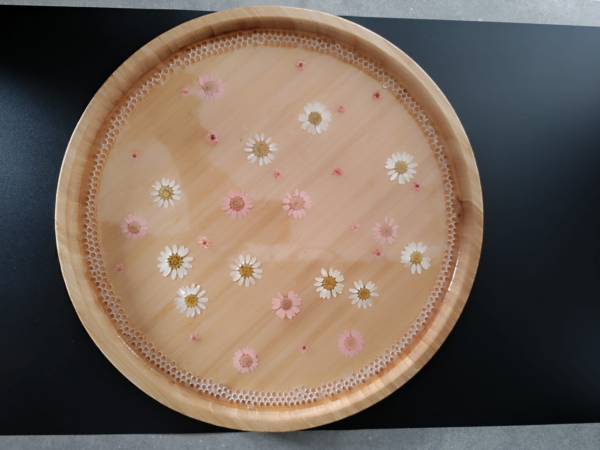🔹 Matériaux : Bois naturel, résine époxy, fleurs séchées