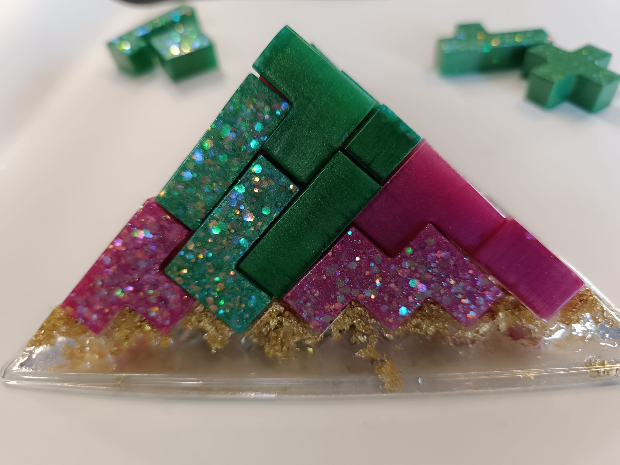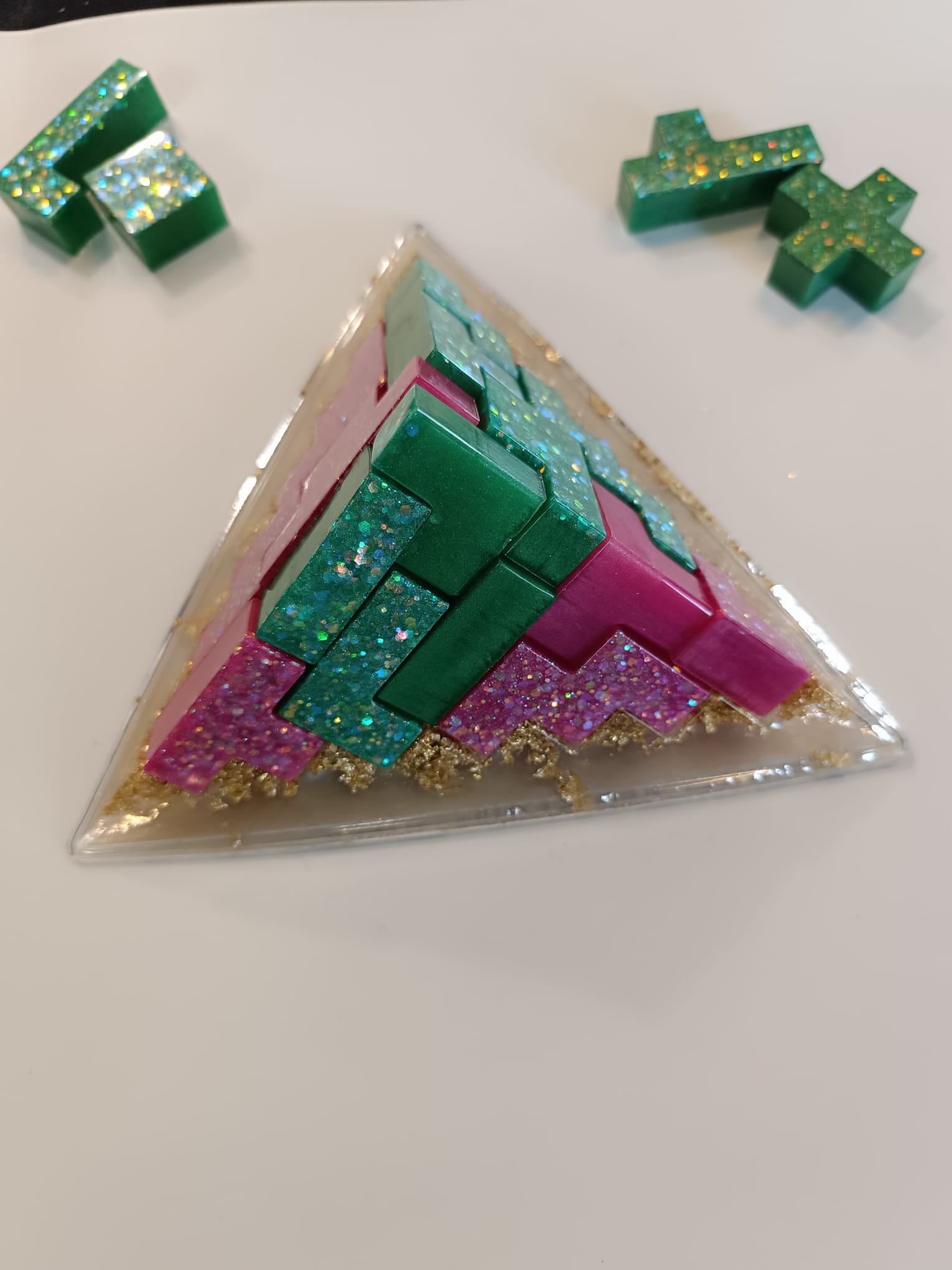 Découvrez ce casse-tête pyramide en résine, entièrement fait main, une création originale mêlant art, jeu et décoration.